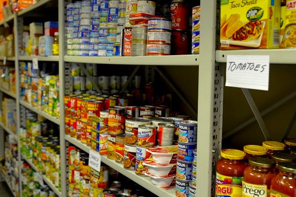 A selection of canned and non-perishable food is available for free on a self-serve food pantry in the Barron Building, 2nd floor.